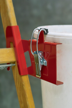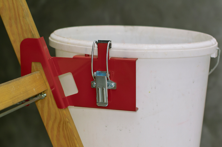 Die neue Kübelbefestigung wird vor dem Aufsteigen auf die Leiter an einem handelsüblichen Farbkübel mit einem Schnellspannverschluss fest montiert und so samt Material, Werkzeug oder sonstigem am Bügel mit auf die Leiter genommen und wird an der Leitersprosse und Holm eingehängt. Vor dem Aufsteigen auf die Leiter kann man durch Einhängen des Kübels an einer unteren Sprosse überprüfen, ob die Leiter im vorgeschriebenen Anstellwinkel von 68°-75° richtig aufgestellt wurde, da die Kübelbefestigung in einem Winkel von 70° angefertigt ist. Durch die feste Verbindung des Kübels mit der Leiter ist es auch wesentlich leichter, die überschüssige Farbe in den Pinseln und Bürsten am Kübelrand auszustreichen, beim eingehängten Kübel am Bügel mit einem Leiterhaken muss man dazu den Kübel mit einer Hand festhalten, wodurch man sich bei dem Vorgang nicht mehr richtig an der Leiter festhalten kann. Material: pulverbeschichtetes Stahlblech