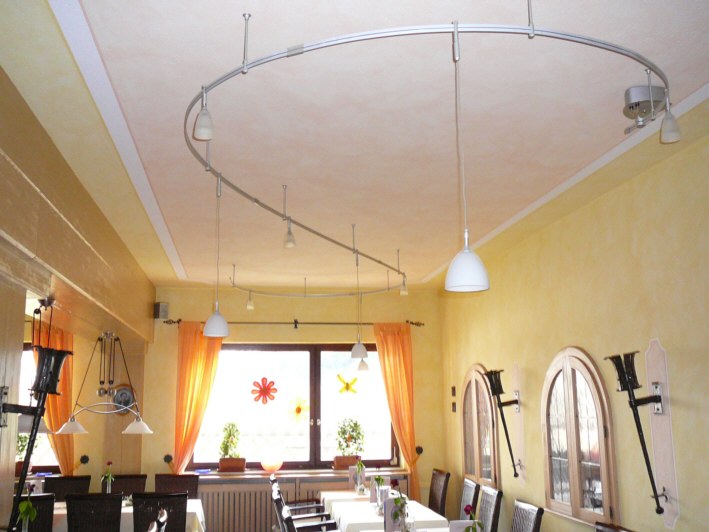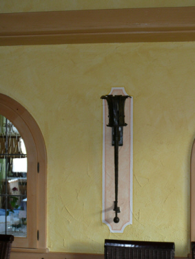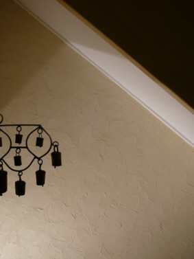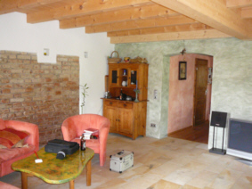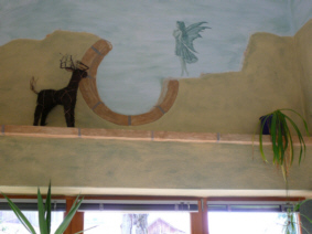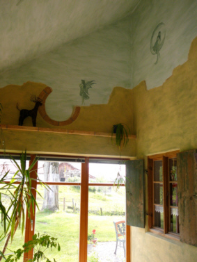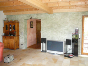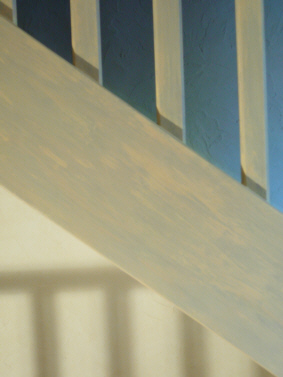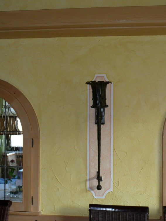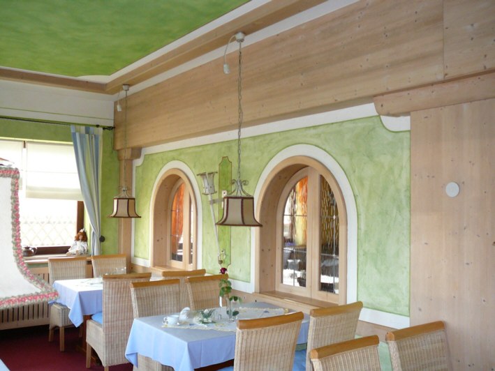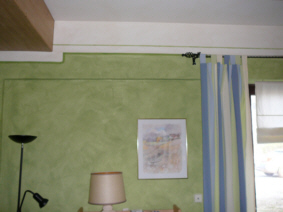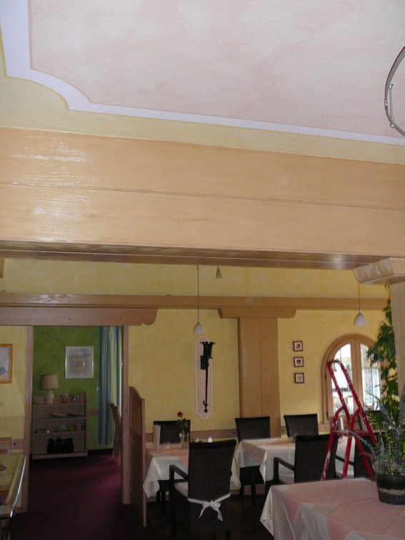 Frühstücksraum und Leseraum in Lasur-Wischtechnik mit Linien versehen.