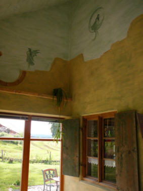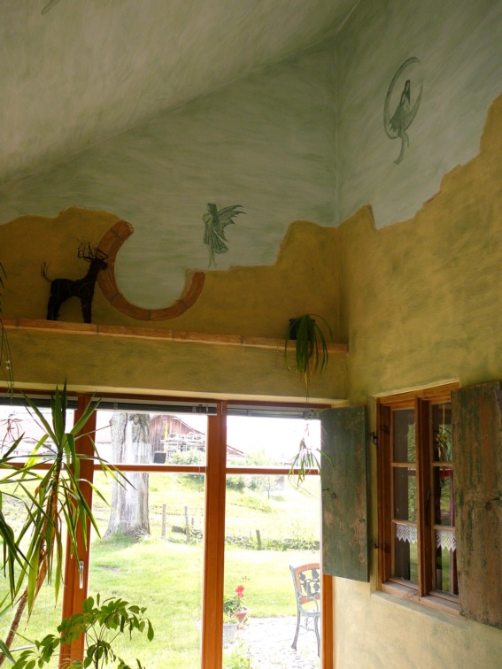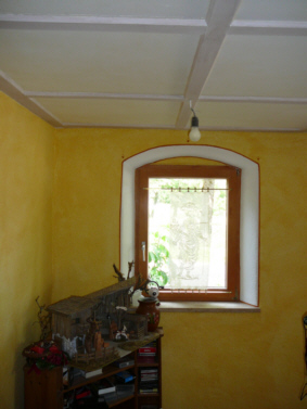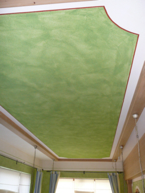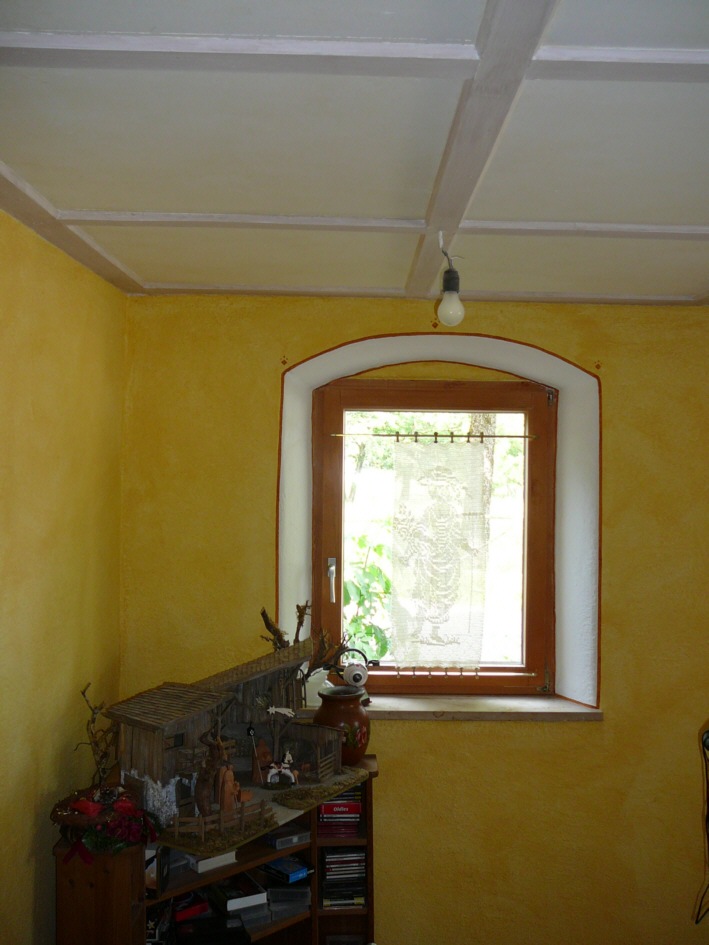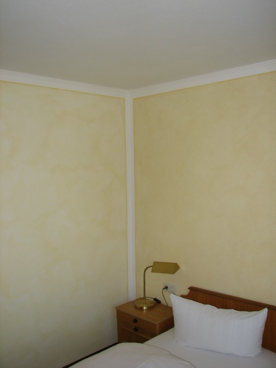 gestrichen, wobei eine Wand in Lasur-Wischtechnik mit drei verschiedenen