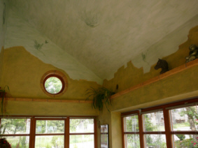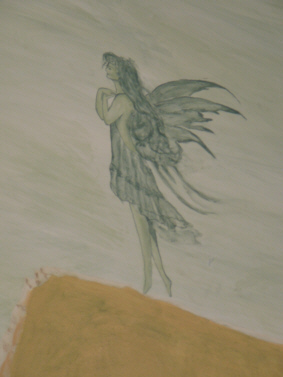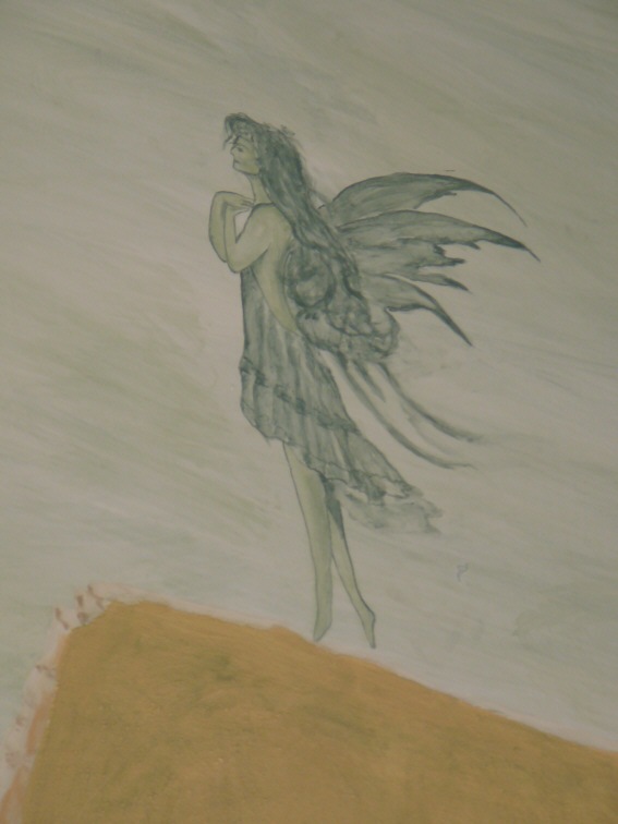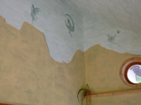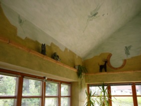 Illusionsmalerei im Wintergarten. Sphärischer Himmel mit Elfen, Abbruchgemäuer mit imitierter Steinoptik