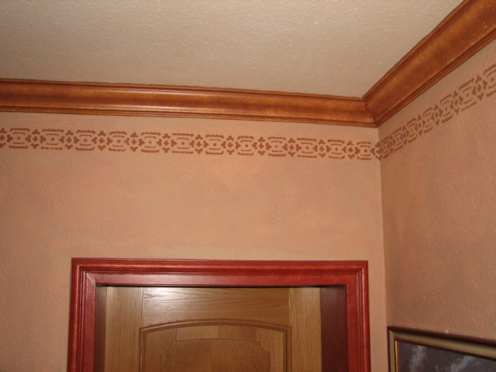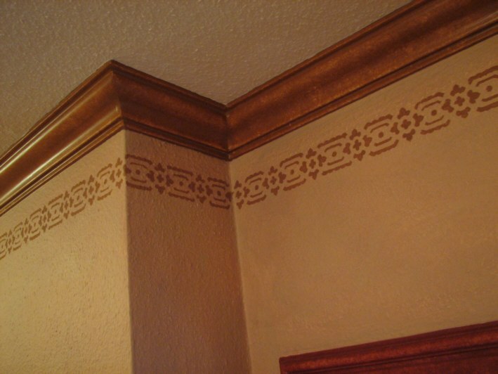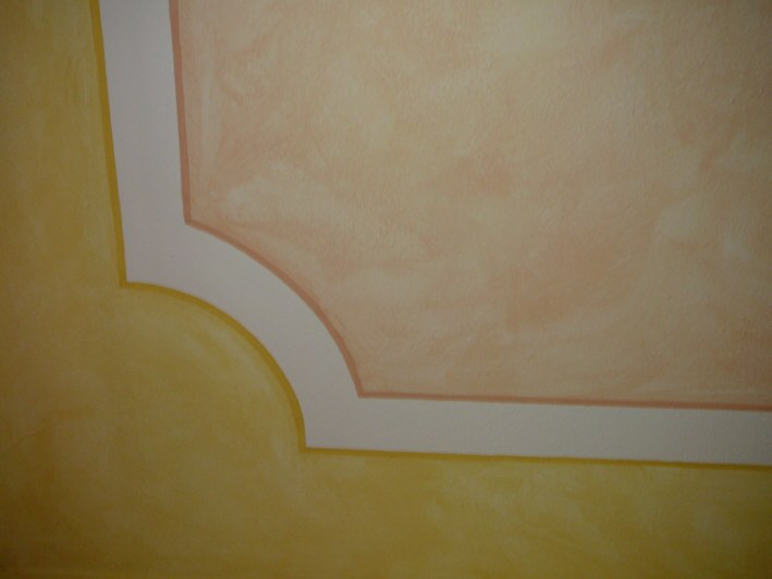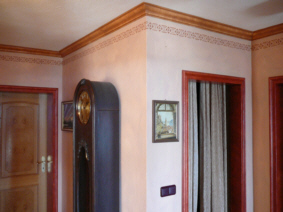 Lasur-Wischtechnik mit marmorierten NMC-Stuckprofilen und Schablonierarbeiten auf Raufasertapete