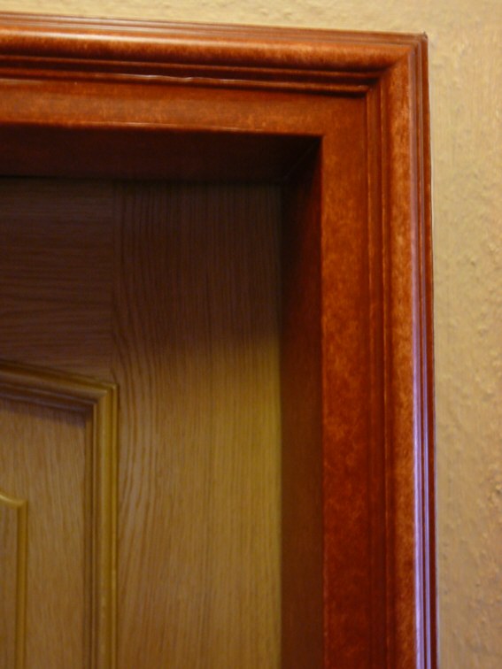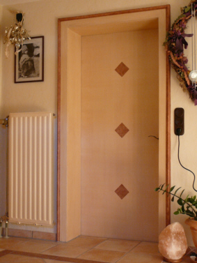 Im Hausgang wurden die Stahlzargen mit Stuckprofilen umklebt und dunkelrot